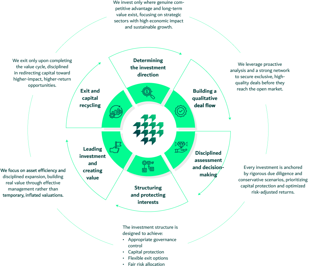 Since its founding in 2013, Madarek Investment has maintained a clear commitment: to build sustainable value that transcends financial returns and achieves a lasting economic impact. We believe that investment is a responsibility before it is an opportunity, and that capital, when managed wisely and with discipline, becomes a tool for building resilient and thriving entities capable of weathering economic cycles. Based on this principle, we have adopted the philosophy of “strategic sustainability” as the guiding principle behind our decisions and the framework for our ambitions.
